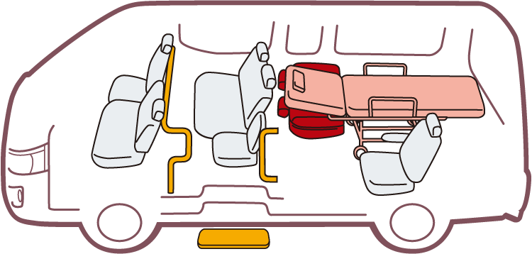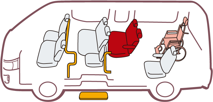 - チェアキャブ 車いす1+1名仕様 1台2役で普段は車いす1名、サードシートの折りたたみで車いす2名乗車も実現。ストレッチャーも乗車可能(マイケアでは用意がありません)